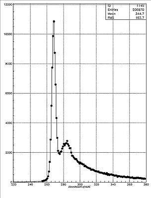 The peak-finder gives a good position for the pedestal, and a roughly good position for the 1-PE peak,(as shown in Figure 3.2, right) the peak-fitter, a MACRO code in PAW which was developed with the help of Andy Smith, will use the positions as good starting points, and get fit result for the peaks, because both pedestal and 1-PE peaks have Gaussian shapes. Compare the result of the peak-finder and peak-fitter, we can see these two steps are necessary.