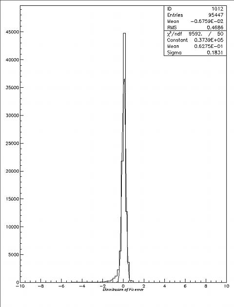 The horizontal axis is ADC, and the vertical axis is the relative fitting error, the same variable as in Fig 5.1. We can see that, for higher ADC the error becomes smaller, the tail contributes to the late hits in the ADC gate in which the ADC count is close to zero but the TOT is still high.