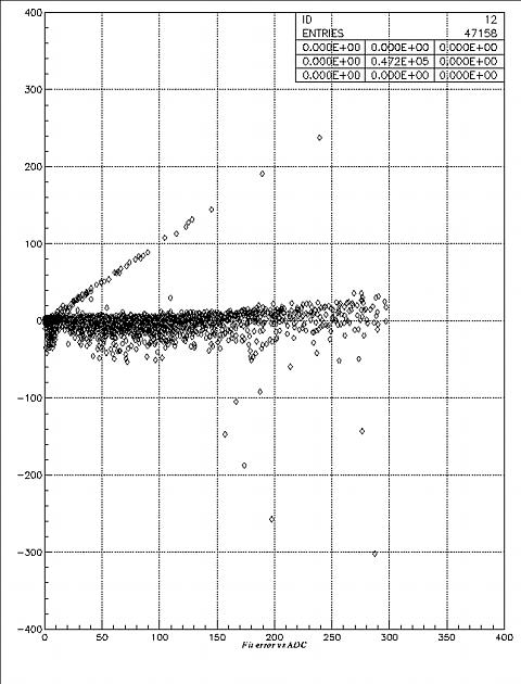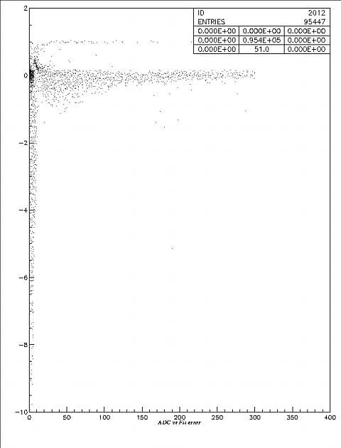 The horizontal axis is ADC, the vertical axis is the deviation between the fitting result and the ADC. We can see that the deviation doesn't change too much when ADC increases, so the relative fitting error drops when the ADC increases.